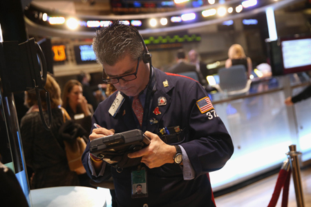 1月13日,一名交易員在美國紐約證券交易所工作。 由于投資者在美國大銀行財報公布前拋盤離場,紐約股市三大股指13日下跌。截至當天收盤,道瓊斯工業(yè)平均指數(shù)比前一個交易日跌179.11點,收于16257.94點。標準普爾500種股票指數(shù)跌23.17點,收于1819.20點。納斯達克綜合指數(shù)跌61.36點,收于4113.30點。