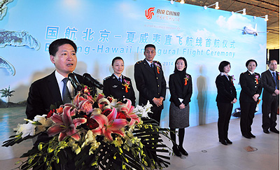2014年1月20日15時,中國國際航空股份有限公司(以下簡稱“國航”)北京-夏威夷直飛航線首航儀式在首都機場3號航站樓舉行。美國駐中國大使館、首都機場海關(guān)、北京出入境邊防檢查總站、北京出入境檢驗檢疫局、北京首都國際機場股份有限公司及中國國際航空股份有限公司的相關(guān)領(lǐng)導(dǎo)應(yīng)邀出席首航儀式。儀式現(xiàn)場,來自夏威夷的舞者以熱情婀娜的草裙舞向來賓展示了夏威夷獨具特色的波利尼西亞文化,并為臺上嘉賓佩戴了絢麗芬芳的花環(huán),活動現(xiàn)場洋溢著濃厚的熱帶風(fēng)情。