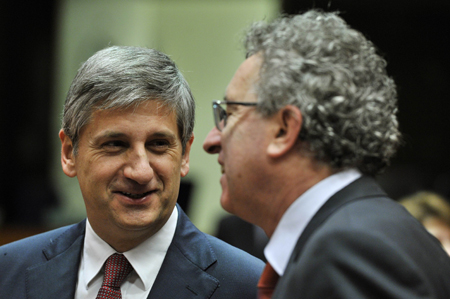 奧地利財長斯賓德萊格(左)28日與盧森堡財長格拉梅格納交談。當(dāng)日,歐盟經(jīng)濟與貨幣事務(wù)理事會(ECOFIN)在布魯塞爾舉行會議。據(jù)悉,本次會議將討論如何進一步推進單一監(jiān)管機制等一系列重要議題。單一監(jiān)管機制是歐盟建立銀行業(yè)聯(lián)盟的重要一步,歐洲央行將于今年11月正式承擔(dān)銀行業(yè)監(jiān)管職能。