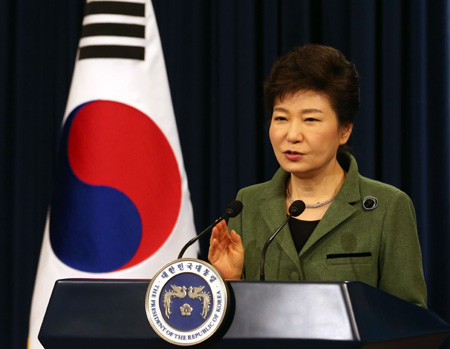 2月25日,韓國(guó)總統(tǒng)樸槿惠在首爾青瓦臺(tái)發(fā)表講話。 韓國(guó)總統(tǒng)樸槿惠25日在就任一周年之際公布了經(jīng)濟(jì)革新三年規(guī)劃,提出到2017年實(shí)現(xiàn)經(jīng)濟(jì)增長(zhǎng)4%、就業(yè)率70%、人均年收入4萬美元的目標(biāo)。