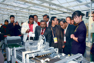 中外游客參觀現(xiàn)代農(nóng)業(yè)示范園區(qū)展示的先進的播種設備