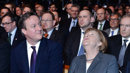 3月9日,在德國漢諾威,德國總理默克爾(前右)和英國首相卡梅倫(前左)出席漢諾威IT展開幕式。 2014年德國漢諾威通信和信息技術(shù)博覽會(huì)(簡稱漢諾威IT展)9日晚拉開帷幕,“數(shù)據(jù)能力”成為本屆展會(huì)主題。
