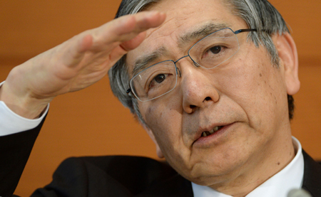 日本中央銀行(日本銀行)11日做出決定,維持現(xiàn)行超寬松貨幣政策不變,同時連續(xù)第六個月對該國經(jīng)濟做出“繼續(xù)溫和復蘇”的評估。盡管日本經(jīng)濟增速放緩,且上調(diào)消費稅措施即將來臨,但日本央行依舊看好日本經(jīng)濟復蘇前景,認為日本經(jīng)濟將逐漸擺脫通縮困局。圖為日本央行總裁黑田東彥在貨幣政策會議結(jié)束后出席新聞發(fā)布會。