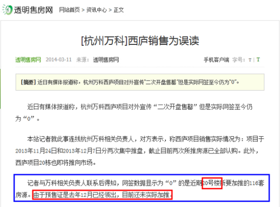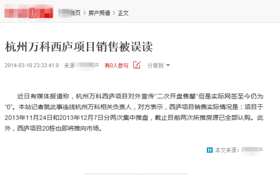 杭州萬科"售罄"項(xiàng)目成交仍為零》的調(diào)查報(bào)道,針對杭州萬科旗下項(xiàng)目——萬科西廬、萬科璞悅灣,“售罄”“熱銷”三個(gè)月后網(wǎng)簽實(shí)際情況與其之前宣傳的“大賣”相去甚遠(yuǎn)進(jìn)行了分析與報(bào)道。