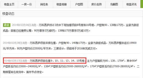 同時(shí)新華網(wǎng)記者發(fā)現(xiàn),根據(jù)杭州萬科的這份聲明,在拿出“捂”了一個(gè)月的預(yù)售證之后,10幢、13幢、14幢、15幢號樓終于在12月7日推向市場了。當(dāng)然,當(dāng)時(shí)對外杭州萬科也繼續(xù)宣稱二次開盤“售罄”。但在透明售房網(wǎng)的樓盤動態(tài)中,2014年2月7日,萬科西廬的9幢、10幢、11幢、13幢、14幢、15幢卻依然在售。曾經(jīng)全部“售罄”的六幢樓又重現(xiàn)市場了。