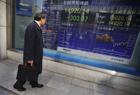 受外部市場普遍低迷、日元對美元匯率明顯回漲以及經(jīng)濟數(shù)據(jù)利空等多重因素打壓,當日東京股市大幅走跌,日經(jīng)225種股票平均價格指數(shù)收盤時比前一個交易日下跌2.59%,失守15000點大關(guān)。圖為在日本首都東京,一名男子觀看股指電子顯示屏。