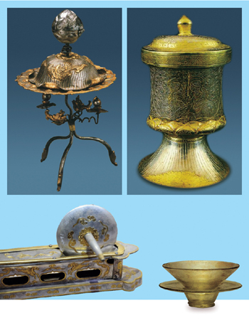 整體取蓮花造型,由蓋、臺(tái)盤和足架構(gòu)成,上飾鎏金摩羯紋。