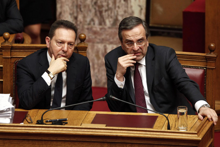 歐元集團(tuán)財(cái)政部長非正式會(huì)議4月1日將在雅典舉行,向希臘發(fā)放救助貸款將是議題之一。希臘議會(huì)當(dāng)天通過的改革法案,或?qū)闅W元集團(tuán)財(cái)政部長發(fā)放下一筆救助貸款掃清道路。投票結(jié)束后,希臘總理、新民主黨領(lǐng)導(dǎo)人薩馬拉斯將該黨一名投反對票的議員開除,這使由新民主黨和泛希臘社會(huì)主義運(yùn)動(dòng)組成的兩黨聯(lián)合政府在議會(huì)只擁有兩席的微弱多數(shù)。圖為希臘總理薩馬拉斯(右)和財(cái)政部長斯圖納拉斯(左)在議會(huì)中等待議員們進(jìn)行投票。