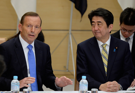 澳大利亞和日本7日在東京就自由貿(mào)易協(xié)定達成一致。澳大利亞成為首個與日本達成貿(mào)易協(xié)定的農(nóng)業(yè)出口國家。據(jù)悉,日本已同意將澳大利亞牛肉進口關(guān)稅由38.5%縮減至一半;澳大利亞基本同意停止對日本收取5%的汽車進口關(guān)稅。日澳雙方將于今年夏天簽訂相關(guān)協(xié)議,為其在2015年生效鋪平道路。圖為7日澳大利亞總理阿博特(左)與日本首相安倍晉三在日本東京舉行高級別會談。