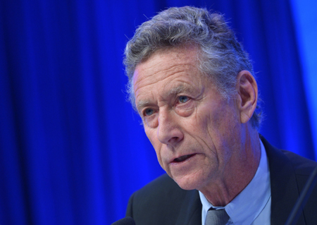 圖為IMF經(jīng)濟參事、研究部門主管奧利維耶·布蘭查德8日在IMF華盛頓總部的新聞發(fā)布會上發(fā)言。