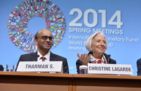 4月12日,在美國首都華盛頓,國際貨幣基金組織(IMF)決策機構(gòu)——國際貨幣與金融委員會呼吁各國在全球經(jīng)濟(jì)復(fù)蘇勢頭上升但依然不夠強勁的背景下,通過結(jié)構(gòu)性改革等措施保持增長。 圖為當(dāng)日國際貨幣與金融委員會主席、新加坡副總理兼財政部長尚達(dá)曼(左)和國際貨幣基金組織(IMF)總裁拉加德出席新聞發(fā)布會。