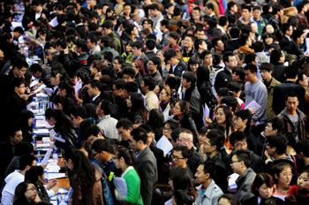 東北大學(xué)2014屆畢業(yè)生春季就業(yè)雙向選擇洽談會上人頭攢動。 新華社發(fā)(張文魁/攝) |