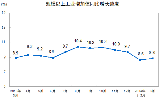 2014年3月份,規(guī)模以上工業(yè)增加值同比實際增長8.8%(以下增加值增速均為扣除價格因素的實際增長率),比1-2月份加快0.2個百分點。從環(huán)比看,3月份比上月增長0.81%。一季度,規(guī)模以上工業(yè)增加值同比增長8.7%。