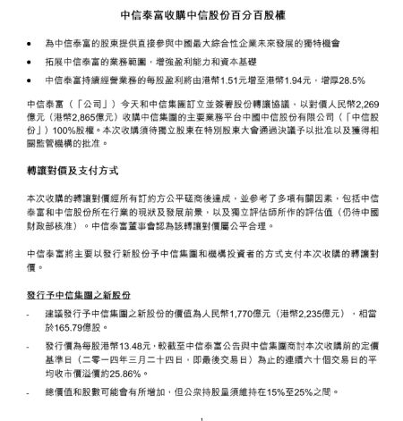 中信泰富公布收購(gòu)中信股份方案,圖為中信泰富新聞稿截圖。(圖片來(lái)源:中信泰富官方網(wǎng)站)