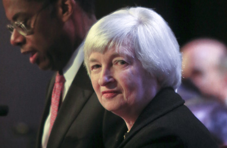 美國聯(lián)邦儲備委員會主席珍妮特·耶倫4月16日表示,根據(jù)中期預(yù)測,美國經(jīng)濟(jì)有望在保持價(jià)格穩(wěn)定的條件下回歸充分就業(yè)。美國失業(yè)率將在2016年底降到5.2%至5.6%,通脹率將升到1.7%至2%。美聯(lián)儲刺激措施仍將持續(xù)相當(dāng)時(shí)間,加息將取決于就業(yè)和通脹的改善程度。 圖為當(dāng)日珍妮特·耶倫(中)在紐約經(jīng)濟(jì)俱樂部出席活動。