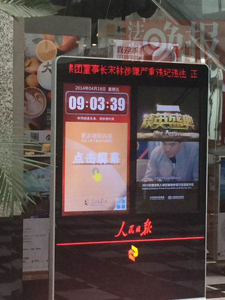 在熙攘人群中記者注意到,大堂一側(cè)滾梯旁立有人民日?qǐng)?bào)電子公告屏幕,上面顯示有日期時(shí)間及精英盛典廣告。