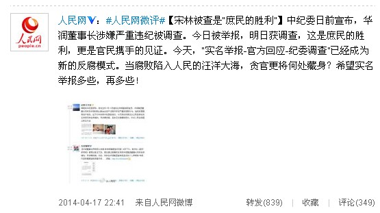 #人民網(wǎng)微評(píng)#【宋林被查是“庶民的勝利”】中紀(jì)委日前宣布,華潤(rùn)董事長(zhǎng)涉嫌嚴(yán)重違紀(jì)被調(diào)查。今日被舉報(bào),明日獲調(diào)查,這是庶民的勝利,更是官民攜手的見(jiàn)證。今天,“實(shí)名舉報(bào)-官方回應(yīng)-紀(jì)委調(diào)查”已經(jīng)成為新的反腐模式。當(dāng)腐敗陷入人民的汪洋大海,貪官更將何處藏身?希望實(shí)名舉報(bào)多些,再多些!