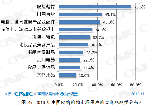 2014年4月,中國互聯(lián)網(wǎng)絡(luò)信息中心CNNIC發(fā)布了《2013年中國網(wǎng)絡(luò)購物市場研究報(bào)告》。報(bào)告顯示,2013年網(wǎng)絡(luò)購物市場穩(wěn)步快速向前發(fā)展,彰