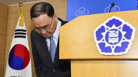 圖為27日在韓國首爾舉行的記者會上,韓國總理鄭烘原在宣布辭職后鞠躬。