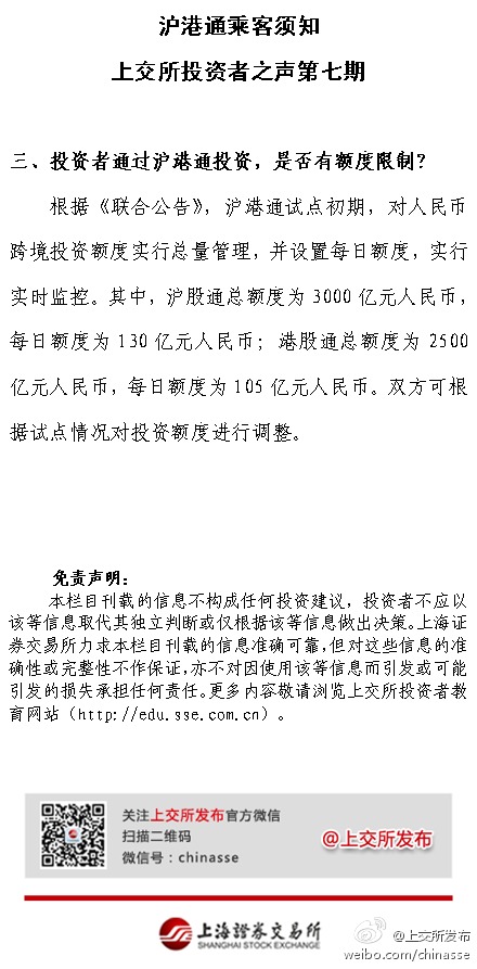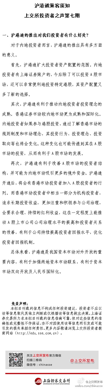 針對“滬港通的推出對我們投資者有什么好處?”的問題,上交所在微博上回應(yīng):滬港通是我國資本市場對外開放的重要內(nèi)容,有利于加強兩地資本市場聯(lián)系,有利于資本市場雙向開放及人民幣國際化,可能為內(nèi)地市場吸引更多的境外資金。