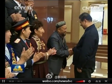 4月30日上午10時(shí)許,習(xí)近平和中共中央政治局常委、全國(guó)政協(xié)主席俞正聲,在中共中央政治局委員、新疆維吾爾自治區(qū)黨委書(shū)記張春賢和自治區(qū)政府主席努爾·白克力陪同下,來(lái)到新疆迎賓館10號(hào)樓會(huì)見(jiàn)廳,接見(jiàn)新疆28名勞動(dòng)模范和先進(jìn)工作者、先進(jìn)人物代表,同他們親切握手、合影留念,之后同他們進(jìn)行了座談。
