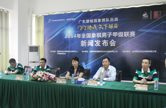 5月4日下午,廣東碧桂園象棋隊(duì)出戰(zhàn)2014年全國(guó)象棋甲級(jí)聯(lián)賽新聞發(fā)布會(huì)在廣東體育館(二沙島)隆重召開(kāi)。出席發(fā)布會(huì)的嘉賓包括碧桂園集團(tuán)總裁助理、戰(zhàn)略發(fā)展部總經(jīng)理羅勁榮,廣東省棋牌運(yùn)動(dòng)管理中心主任、中國(guó)象棋特級(jí)大師呂欽,廣州棋院副院長(zhǎng)、中國(guó)象棋特級(jí)大師許銀川,廣東省二沙體育訓(xùn)練中心主任林瑛,廣東碧桂園象棋隊(duì)全體成員及多家廣東主流媒體。