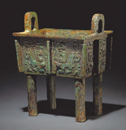 中國(guó)的青銅器主要指先秦時(shí)期用銅錫合金制作的器物,有禮器、炊器、食器、酒器、樂器等,流行于新石器時(shí)代晚期至秦漢時(shí)代。夏代晚期,青銅器的鑄造技術(shù)已經(jīng)基本熟練,銅器造型初具規(guī)范,器壁勻薄。商代前中期是中國(guó)青銅器藝術(shù)趨于成熟的發(fā)展時(shí)期,以酒器為主的禮器體制初步建立。青銅器構(gòu)圖繁密,線條峻深勁利。滿布器身的紋飾大量采用浮雕和平雕相結(jié)合的方法,精美絕倫,夸張、象征手法的獸面紋既莊嚴(yán)神秘又富有生氣。周初禮器出現(xiàn)了向重食體制轉(zhuǎn)變的端倪,鑄記長(zhǎng)篇銘文是西周青銅禮器的重要特點(diǎn)。新的器型端莊厚重,動(dòng)物紋飾或流轉(zhuǎn)舒暢,或樸質(zhì)簡(jiǎn)率。春秋戰(zhàn)國(guó)時(shí)期,器物的生活實(shí)用性加強(qiáng),禮器的功用逐漸消失。失蠟法和印模塊范拼合法的產(chǎn)生,使鑲嵌工藝絢麗工巧。這一時(shí)期的青銅器造型新穎精美,器形多樣,紋飾繁縟富麗,多為譎奇精麗之器。被視為國(guó)之重器的青銅器自古以來(lái)就是收藏家眼中的頂級(jí)收藏品,F(xiàn)階段由于各方面的原因,中國(guó)古代青銅藝術(shù)品處在價(jià)格洼地,但是其豐富的藝術(shù)價(jià)值是毋庸置疑的。