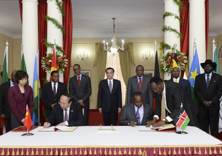 5月11日,國務(wù)院總理李克強(qiáng)在內(nèi)羅畢和肯尼亞總統(tǒng)肯雅塔、烏干達(dá)總統(tǒng)穆塞維尼、南蘇丹總統(tǒng)基爾、盧旺達(dá)總統(tǒng)卡加梅,以及坦桑尼亞、布隆迪的總統(tǒng)代表共同見證中國肯尼亞關(guān)于蒙巴薩-內(nèi)羅畢鐵路建設(shè)相關(guān)合作文件簽署。