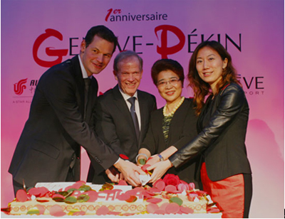 日內(nèi)瓦國際機場首席執(zhí)行官羅伯特·德隆對該航線開通一年來取得的成功表示祝賀,他代表機場對國航提供的高品質服務表示衷心感謝,并對國航一年來所開展的各種有效營銷措施表示贊許,他認為一年來的雙方的合作十分愉快,相互信任與支持,業(yè)務發(fā)展成效顯著。他還用數(shù)字舉例,2013年來自中國的游客數(shù)量同期增長了22%,2014年1-2月份就增加了近18%,他對雙方合作未來發(fā)展的前景十分看好。同時他還提到日內(nèi)瓦國際機場與北京國際機場自締結簽署“姊妹機場”友好合作關系一年來,雙方在不同的領域展開了多種合作與交流,為雙方帶來新的機遇、新的思維,促進雙方在更深入的領域進行合作與發(fā)展。