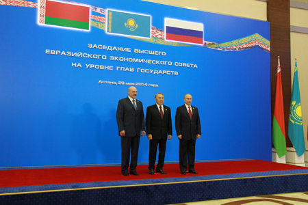 俄羅斯、白俄羅斯、哈薩克斯坦三國總統(tǒng)5月29日在哈首都阿斯塔納簽署《歐亞經濟聯盟條約》。根據條約,歐亞經濟聯盟將于明年1月1日正式啟動,到2025年俄白哈三國將實現商品、服務、資金和勞動力的自由流動,終極目標是建立類似于歐盟的經濟聯盟。條約涉及能源、交通、工業(yè)、農業(yè)、關稅、貿易、稅收和政府采購等諸多領域。
