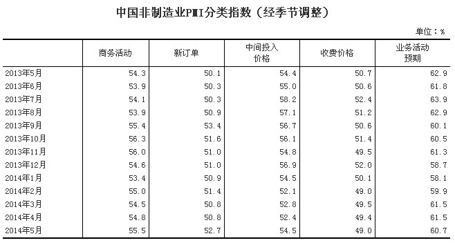 2014年5月,中國非制造業(yè)商務(wù)活動(dòng)指數(shù)為55.5%,比上月上升0.7個(gè)百分點(diǎn),高于榮枯線5.5個(gè)百分點(diǎn)。