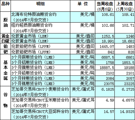 國際大宗商品期貨價格明細表[2014-6-9]