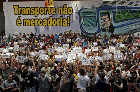 6月8日,地鐵工人在巴西圣保羅舉行示威。 當(dāng)日,巴西一家地區(qū)勞動(dòng)法院判決日前的地鐵罷工為“非法”,并向相關(guān)工會組織開出了50萬雷亞爾(約22.3萬美元)/天的高額罰款。2014年世界杯揭幕戰(zhàn)舉辦地、巴西最大城市圣保羅5日發(fā)生的地鐵罷工已經(jīng)進(jìn)入第五天,造成該市大面積交通擁堵!