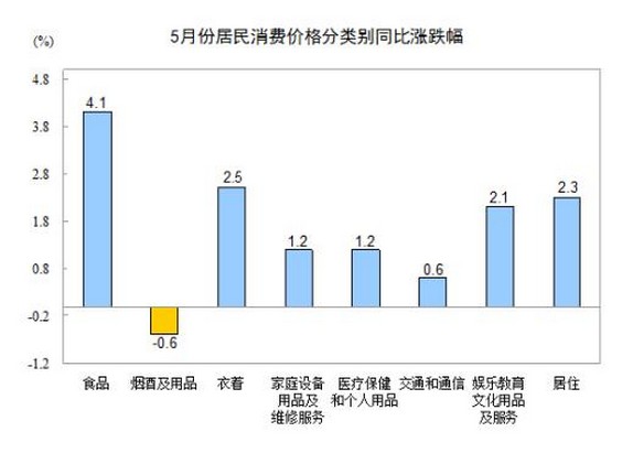 5月份,全國居民消費價格總水平環(huán)比上漲0.1%。其中,城市上漲0.1%,農(nóng)村上漲0.2%;食品價格上漲0.2%,非食品價格上漲0.1%;消費品價格上漲0.1%,服務價格持平(漲跌幅度為0,下同)。