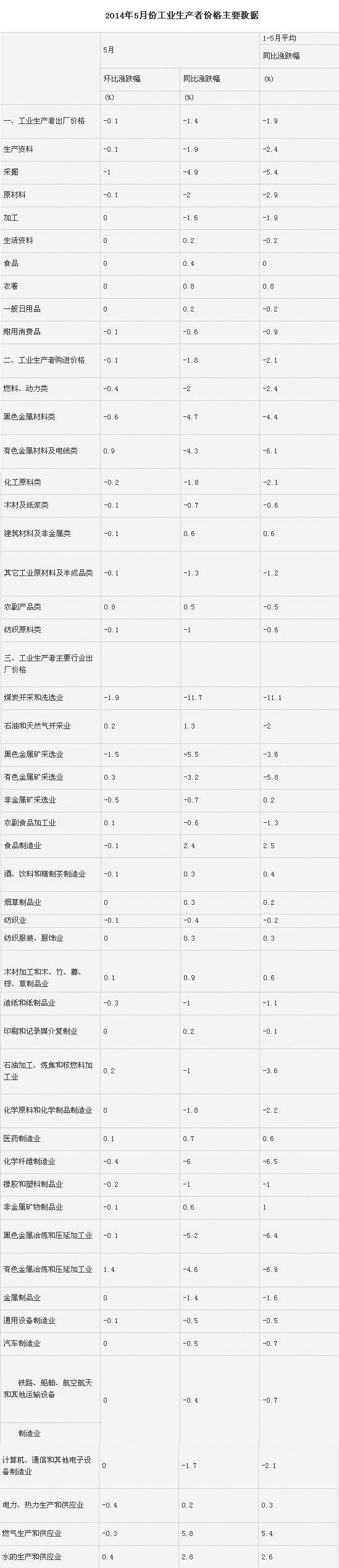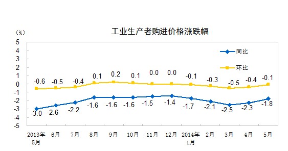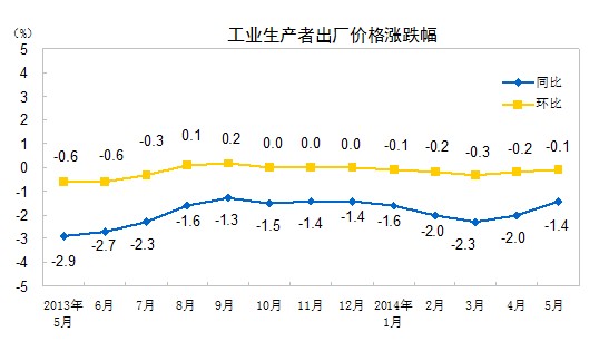 2014年5月份,全國工業(yè)生產(chǎn)者出廠價格同比下降1.4%,環(huán)比下降0.1%。工業(yè)生產(chǎn)者購進價格同比下降1.8%,環(huán)比下降0.1%。1-5月平均,工業(yè)生產(chǎn)者出廠價格同比下降1.9%,工業(yè)生產(chǎn)者購進價格同比下降2.1%。
