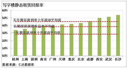 據(jù)上圖,長沙、重慶寫字樓投資回報率高于房地產(chǎn)上市公司收益率,高回報往往是以高風(fēng)險為前提的,過高的回報率意味著未來房地產(chǎn)市場逆轉(zhuǎn)的高風(fēng)險。因此,當(dāng)房產(chǎn)投資回報率高于房地產(chǎn)信托和上市公司收益率時,意味著投資決策時要謹慎應(yīng)對。