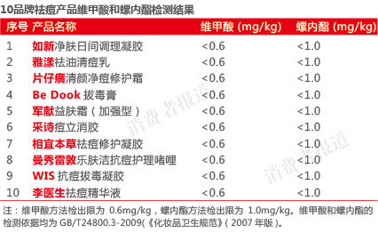 本刊此次就選擇了維甲酸和螺內(nèi)酯進行檢測。據(jù)檢測結(jié)果顯示,10款產(chǎn)品兩物質(zhì)含量均低于檢出限0.6mg/kg和1.0mg/kg。