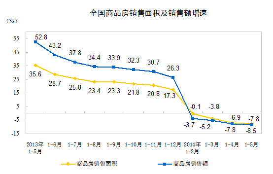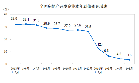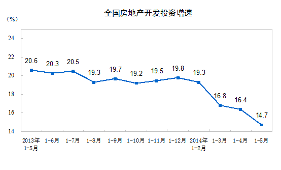 2014年1-5月份,全國房地產(chǎn)開發(fā)投資30739億元,同比名義增長14.7%,增速比1-4月份回落1.7個(gè)百分點(diǎn)。其中,住宅投資21043億元,增長14.6%,增速回落2個(gè)百分點(diǎn),占房地產(chǎn)開發(fā)投資的比重為68.5%。