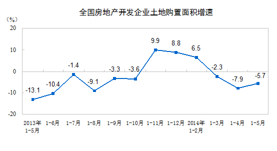 1-5月份,房地產(chǎn)開發(fā)企業(yè)土地購置面積11090萬平方米,同比下降5.7%,降幅比1-4月份收窄2.2個(gè)百分點(diǎn);土地成交價(jià)款2954億元,增長8.7%,增速回落0.9個(gè)百分點(diǎn)。