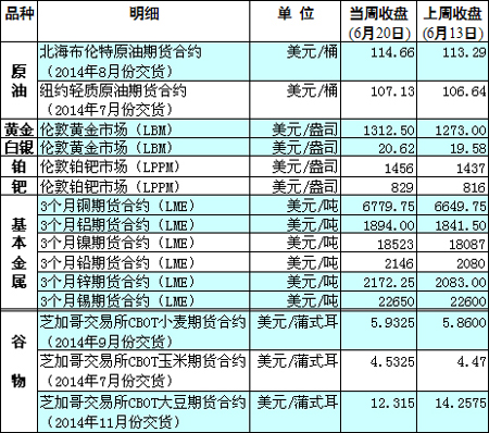 國際大宗商品期貨價格明細表[2014-6-23]