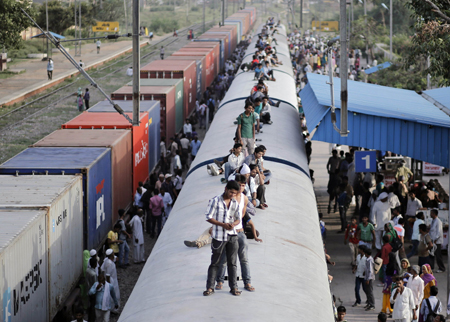 圖為,7日在印度洛尼,乘客搭乘一列超載的火車(chē)出行。