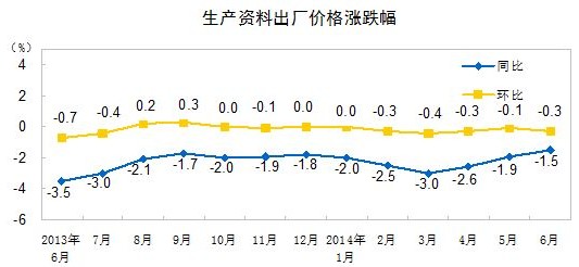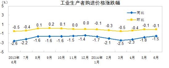 2014年6月份,全國工業(yè)生產(chǎn)者出廠價(jià)格同比下降1.1%,環(huán)比下降0.2%。工業(yè)生產(chǎn)者購進(jìn)價(jià)格同比下降1.5%,環(huán)比下降0.1%。上半年,工業(yè)生產(chǎn)者出廠價(jià)格同比下降1.8%,工業(yè)生產(chǎn)者購進(jìn)價(jià)格同比下降2.0%。