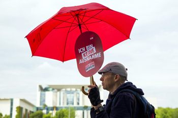 在德國柏林總理府前,一名男子持傘參加工會組織的游行活動,支持每小時8.5歐元的全國最低工資標準。新華社/路透 |