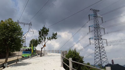 南方電網(wǎng)高壓線架設(shè)于觀音山上山必經(jīng)之路之上,距離之近幾近伸手可觸,黃淦波說,因?yàn)檫@組高壓線,一到陰雨天就沒人敢上山了。記者 張彬 攝