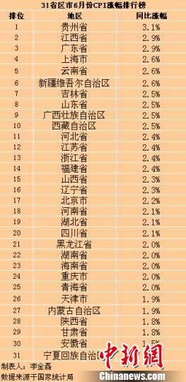 與全國2.3%的漲幅相比,貴州、江西、廣東、上海、云南、新疆、吉林、山東、廣西、西藏、河北、江蘇、浙江、福建這14個(gè)地區(qū)6月份的CPI漲幅超過了全國水平。