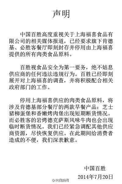 央視新聞【百勝集團(tuán)回應(yīng):封存停用涉事原料】針對(duì)供應(yīng)商提供問題原料被曝光一事,肯德基、必勝客所屬的百勝餐飲集團(tuán)回應(yīng):即刻封存并停用由上海福喜提供的所有肉類食品原料。因停用上海福喜供應(yīng)原料造成三款產(chǎn)品出現(xiàn)臨時(shí)斷貨,已緊急調(diào)配其他供應(yīng)商資源。