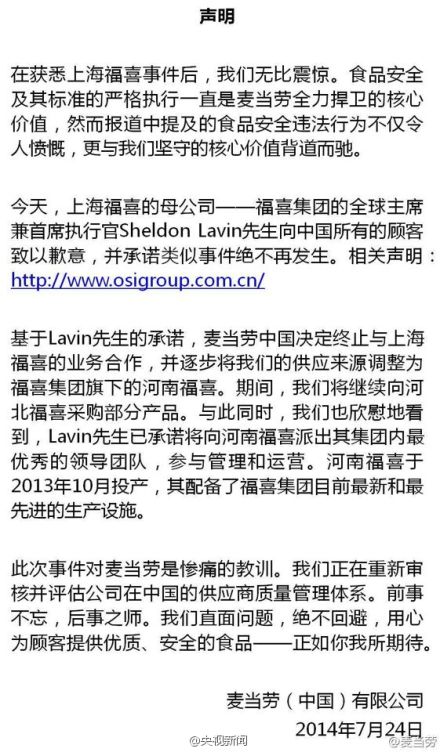 @央視新聞:#麥當(dāng)勞肯德基供應(yīng)商被曝光#【麥當(dāng)勞終止與上海福喜的合作】@麥當(dāng)勞 今晨發(fā)布聲明稱(chēng),上海福喜母公司福喜集團(tuán)全球主席兼首席執(zhí)行官向中國(guó)所有顧客致歉,并承諾類(lèi)似事件絕不發(fā)生;谄涑兄Z,麥當(dāng)勞中國(guó)決定終止與上海福喜的業(yè)務(wù)合作,并將供應(yīng)來(lái)源調(diào)整為福喜旗下的河南福喜。(央視記者陳雯 王殿甲)