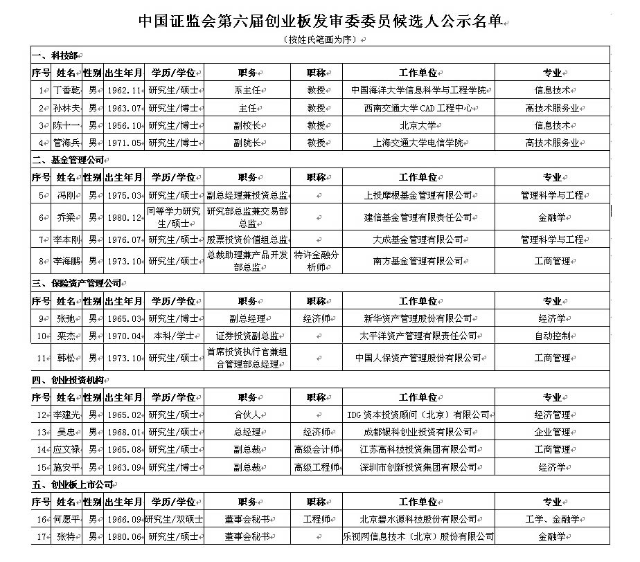 根據(jù)《中國證券監(jiān)督管理委員會(huì)發(fā)行審核委員會(huì)辦法》(證監(jiān)會(huì)令第62號(hào)),第五屆創(chuàng)業(yè)板發(fā)審委將于近期屆滿。我會(huì)決定對委員進(jìn)行部分更換。各單位依程序向我會(huì)推薦了17名委員候選人,F(xiàn)將第六屆創(chuàng)業(yè)板發(fā)審委17名委員候選人名單予以公示(詳見附件)。