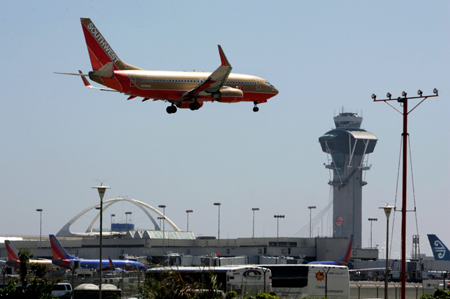 圖為一架美國(guó)西南航空公司的客機(jī)在洛杉磯國(guó)際機(jī)場(chǎng)準(zhǔn)備著陸。