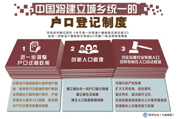 我國實行了半個多世紀(jì)的“農(nóng)業(yè)”和“非農(nóng)業(yè)”二元戶籍管理模式將退出歷史舞臺。7月30日,備受關(guān)注的國務(wù)院《關(guān)于進(jìn)一步推進(jìn)戶籍制度改革的意見》(以下簡稱《意見》)公之于眾!兑庖姟诽岢,將建立城鄉(xiāng)統(tǒng)一的戶口登記制度,進(jìn)一步調(diào)整戶口遷移政策,擴(kuò)大基本公共服務(wù)覆蓋面。